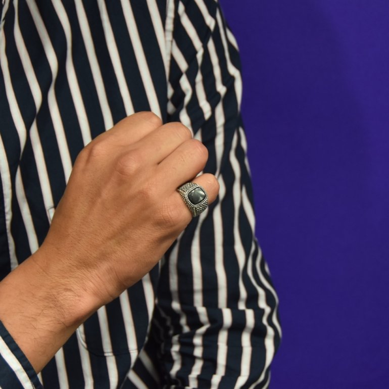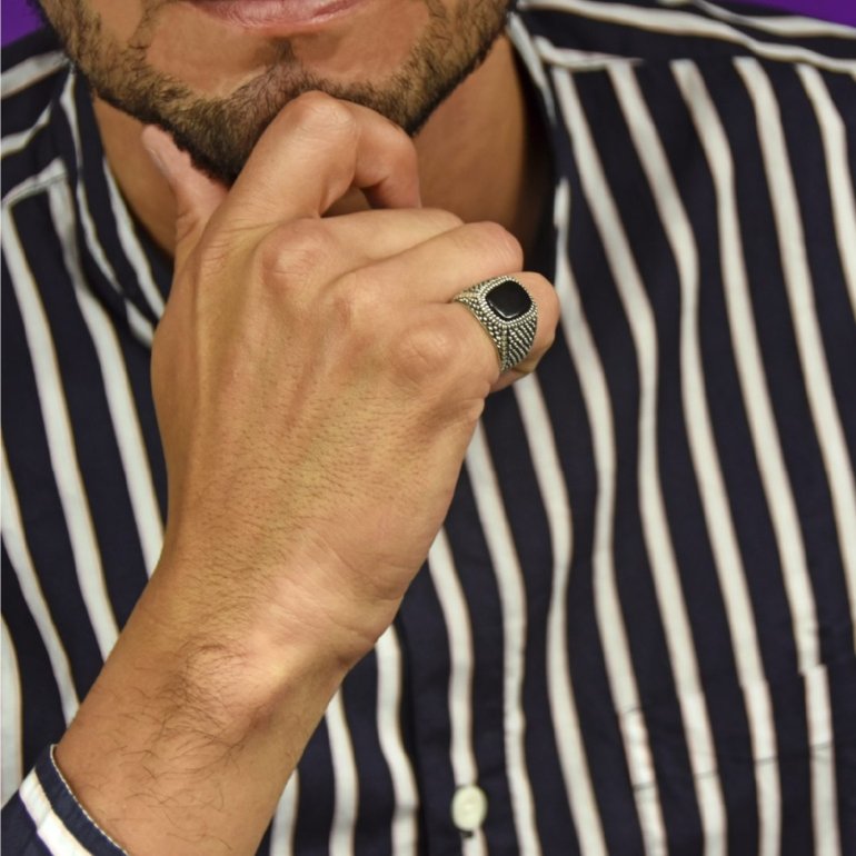 Este es un hermoso anillo de terminado envejecido y onix en forma rectangular con detalles por donde se le vea.