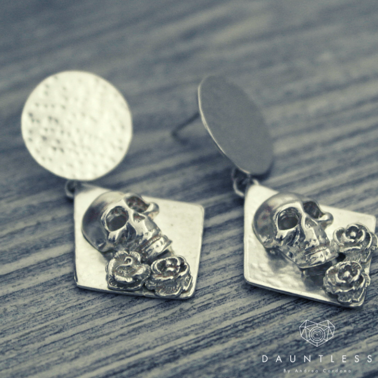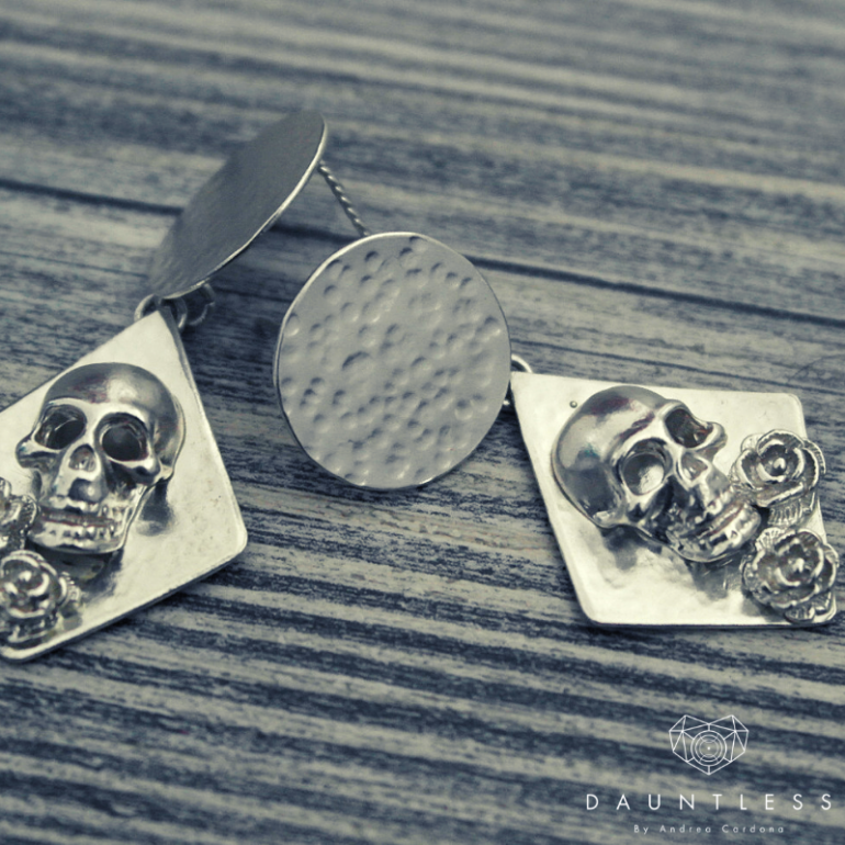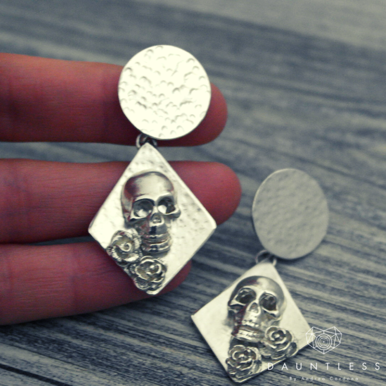 No pierdas la oportunidad de llevar tu amor por las calaveras con estos aretes en plata martillada de formas geométricas. Únicos y especiales.
