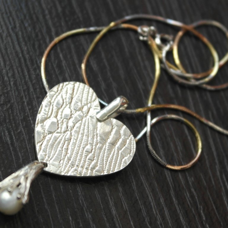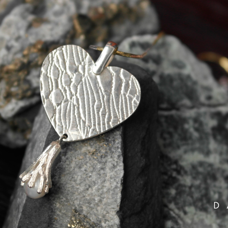 Collar de corazón de plata con textura de encaje y dije de nido con perla cultivada.