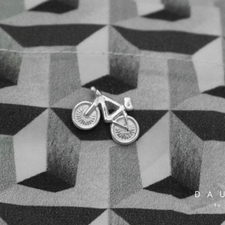 Pin en forma de bicicleta en plata.