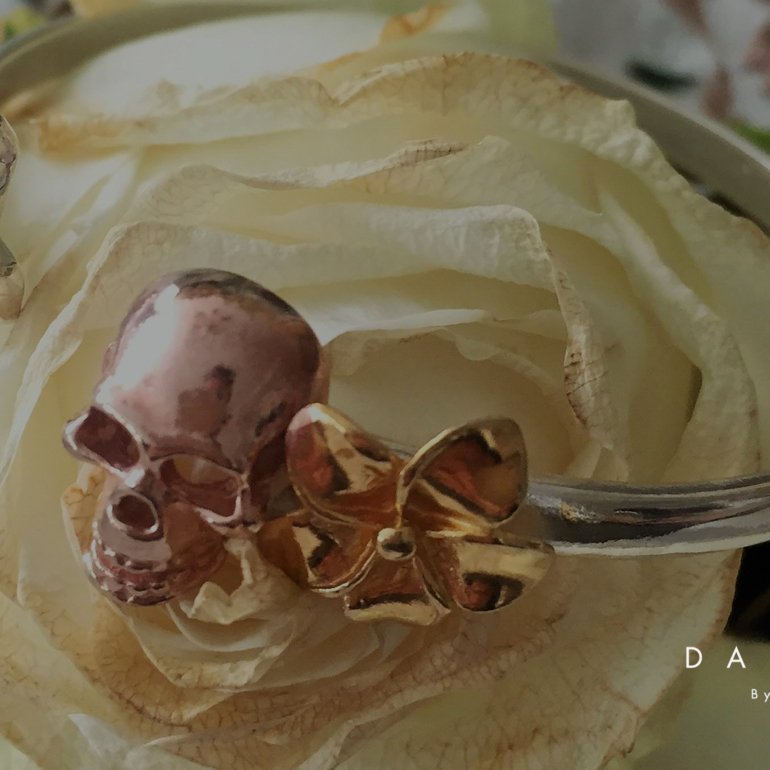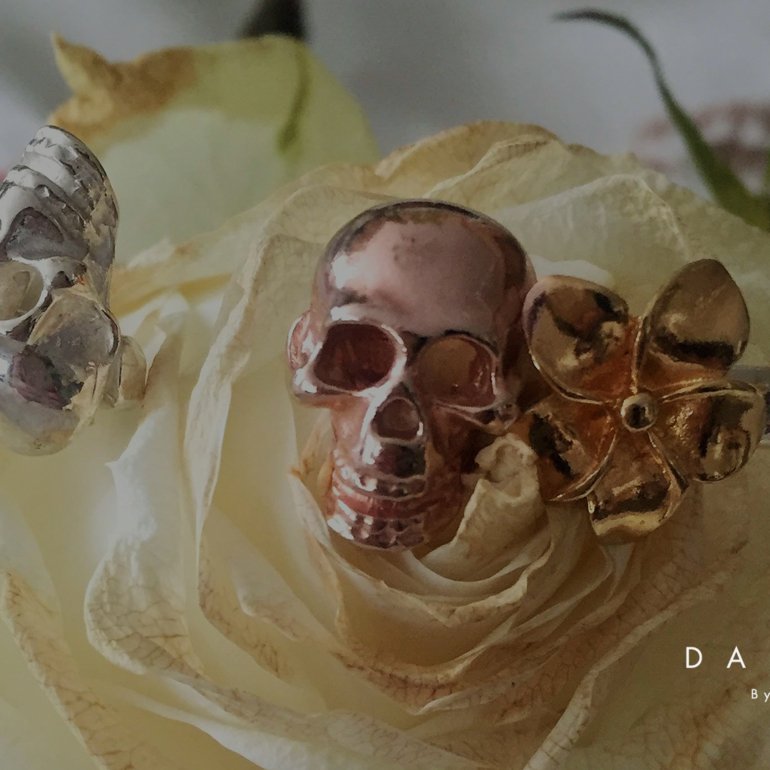 El color de las calaveras y la flor es personalizado. Puede ser con baño rosa, dorado o envejecido.