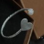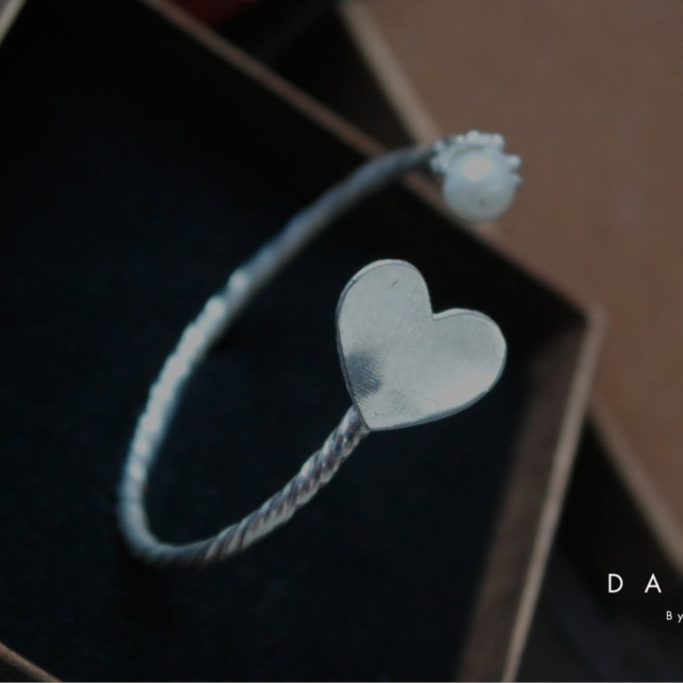 Aro en plata con perla en un extremo engastada en con hilos de plata que imitan un nido y corazón en el otro. La medida del corazón es de 1,5 centímetros.