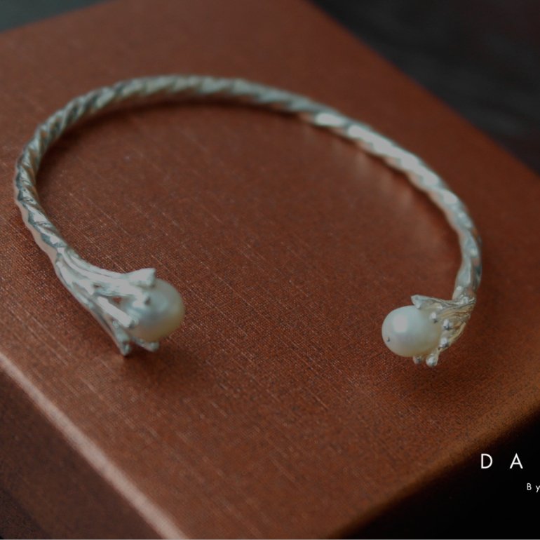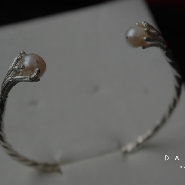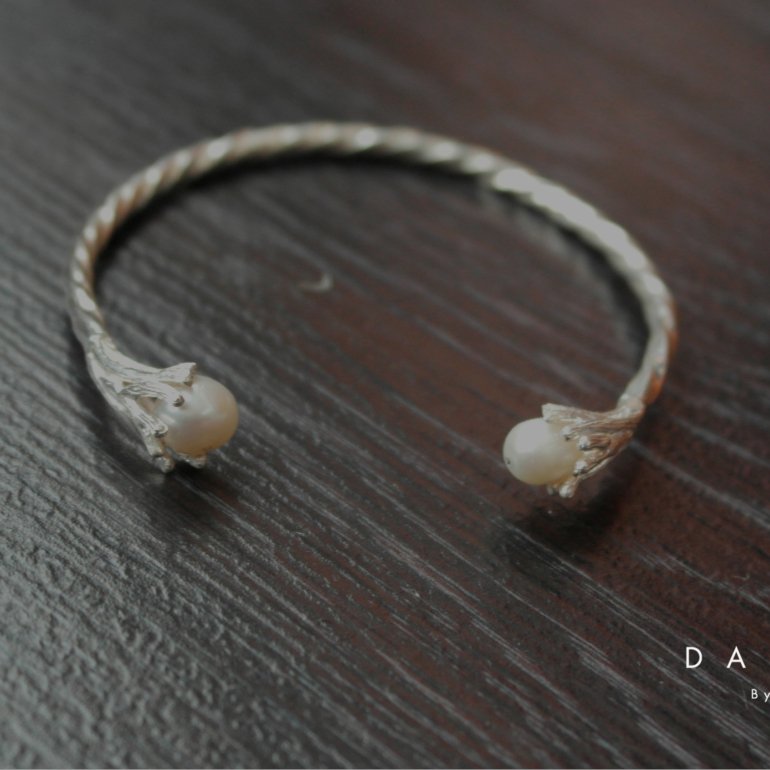 Aro en plata con perlas cultivadas en cada extremo. Cada perla esta engastada con hilos de plata que imitan un nido.